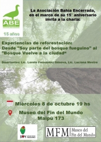 El Miércoles 8 de Octubre de 2025 se realizará la Charla "Experiencias de reforestación: desde Soy Parte del Bosque Fueguino al Bosque Vuelve a la Ciudad". La misma estará a cargo de la Lic. Loreto Fernandez Génova y de la Lic. Luciana Mestre.