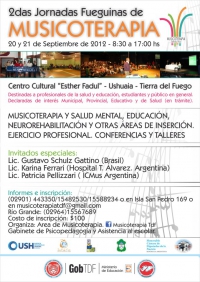 Los días Jueves 20 y Viernes 21 de Septiembre de 2012 se llevarán a cabo las 2°Jornadas Fueguinas de Musicoterapia. Las mismas están destinadas a profesionales de la salud y la educación, estudiantes y público en general.