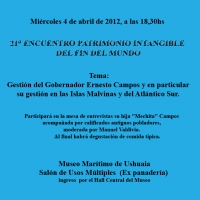El Miércoles 4 de Abril de 2012 se llevará a cabo el 21° Encuentro Patrimonio Intangible del Fin del Mundo. Se tratará el tema "Gestión del Gobernador Ernesto Campos y en particular su gestión en las Islas Malvinas y del Atlántico Sur". Participarán "Mechita" Campos, hija del ex Gobernador, junto a antiguos pobladores.