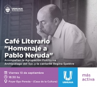 El Viernes 13 de Septiembre de 2019 se realizará el Café Literario en Homenaje a Pablo Neruda. Se repasará algunas de sus obras con la compañía de la Agrupación Folclórica Archipiélago del Sur y de la artista Regina Spektre.