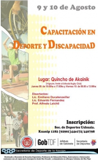 El Jueves 9 y el Viernes 10 de Agosto de 2012 se desarrollará una "Capacitación en Deporte y Discapacidad", a cargo del Lic. Emiliano Ducatenzeiller, el Lic. Eduardo Fernández y el Prof. Alfredo Leichtl. El mismo está destinado a Docentes de Escuelas Especiales, Prof. de Educación FÃsica, Instructores e interesados.