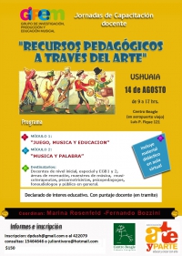 El Martes 14 de Agosto de 2012 se llevará a cabo una capacitación docente en "Recursos pedagógicos a traves del arte", destinado a docentes, áreas de recreación, maestros de música, musicoterapeutas, psicomotricistas, psicopedagogos, fonoaudiólogos y público en general.