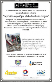El Miércoles 28 de Marzo de 2012 se realizará una charla abierta sobre la "Expedición Arqueológica a la Costa Atlántica Fueguina". La conferencia estará a cargo del Director Provincial de Museos y Patrimonio Cultural Lic. MartÃn Vásquez,los investigadores Chris Underwood y Cristian Murray del Programa de ArqueologÃa Subacuática, la Lic. Mónica Grosso del Instituto Nacional de AntropologÃa y Pensamiento Latinoamericano y la Investigadora Dolores Elkin del CONICET.