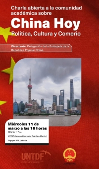 El Miércoles 11 de Marzo de 2026 se brindará la charla "China Hoy. Política, cultura y comercio", a cargo de la Delegación de la Embajada de la República Popular China. La misma tendrá lugar en SUM del 1° piso de la UNTDF a las 16:00 hs.