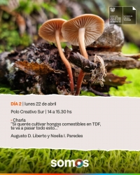 El lunes 22 de Abril de 2024 se realizará la charla "Si queres cultivar hongos comestibles en TDF, te va a pasar todo esto…" con los disertantes Augusto D. Liberto y Noelia L. Paredes de 14 a 15:30 hs. en el Polo Creativo -Gobernador Paz 836, Ushuaia-.