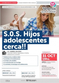 El Sábado 31 de Octubre de 2015 se llevará a cabo la charla "SOS Hijos adolescentes cerca". La misma estará a cargo del Lic Gabriel Salcedo Orientador familiar, especialista en familia, adolescencia y juventud.