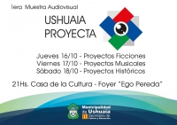 Desde el Jueves 16 hasta el Sábado 18 de Octubre de 2014 se realizará la 1° Muestra Audiovisual "Ushuaia Proyecta" en el Foyer de la Casa de la Cultura a las 21:00 hs. Entrada libre y gratuita.