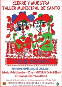 El Sábado 10 de Diciembre de 2011 se realizará el Cierre y muestra del Taller Municipal de Canto dictado por la Prof. Ximena Cholvis. El mismo tendrá lugar en la Antigua Casa Beban a las 20:00 hs. La entrada es libre y gratuita.