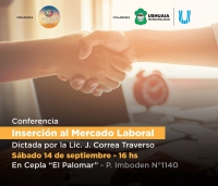 El Sábado 14 de Septiembre tendrá lugar la conferencia "Inserción al Mercado Laboral", dictada por la Licenciada Juliana Correa Traverso.
