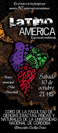 El Sábado 10 de Octubre de 2015 el Coro de la Facultad de Ciencias Exactas, Físicas y Naturales de la Universidad Nacional de Córdoba presentará su espectáculo multimedia Latino América en la Sala Niní Marshall de la Casa de la Cultura a las 21:00 hs.