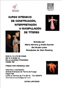 Los días Domingo 8, Sábado 14 y Domingo 15 de Mayo de 2011 se dictará el Curso Intensivo de Construcción, Interpretación y Manipulación de Títeres. El mismo estará a cargo de Mario Herrero y Analía Ojunian del Grupo Luces. El curso tendrá lugar en la Alianza Francesa, de 14:00 a 20:30 hs. Tiene un valor de 150 pesos por persona.