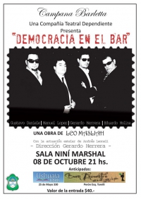 El dÃa Sábado 8 de Octubre la CompañÃa Teatral Dependiente "Campana Barletta" pondrá en escena la obra de Leo Masliah "Democracia en el Bar".