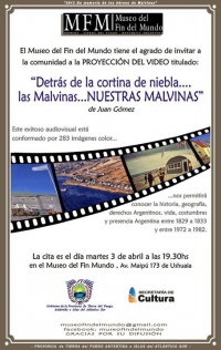 El Martes 3 de Abril de 2012 será proyectado el audiovisual "Detrás de la cortina de niebla... las Malvinas... nuestras Malvinas" de Juan Gómez.