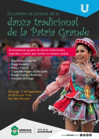 El Domingo 11 de Septiembre de 2016 se realizará el Encuentro de Jóvenes de la Danza Tradicional de la Patria Grande, con la participación de Supremacía Caporal, Fuego Andino, Alma y Pasión, Caporales Virgen de Urcupiña, Raíces Fuerza y Tradición y Corazón de Fuego.