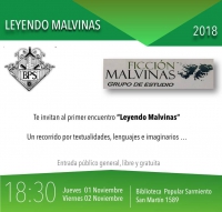 Los días Jueves 1º y Viernes 2 de Noviembre de 2018 se realizará el encuentro "Leyendo Malvinas - Un recorrido por textualidades, lenguajes e imaginarios..." en la Biblioteca Popular Sarmiento a las 18:30 hs. con entrada libre y gratuita.