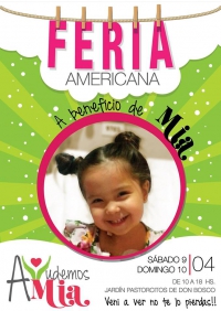 El Sábado 9 y Domingo 10 de Abril de 2016 se realizará una Feria Americana a beneficio de la pequeña Mía, en el Jardín Pastorcitos de Don Bosco de 10:00 a 18:00 hs.