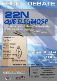 El Sábado 14 de Noviembre de 2015 se realizará el Foro Debate 22 N ¿Qué elegimos?, en el maco del primer ballotage de la República Argentina.