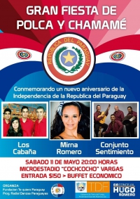 El sábado 11 de mayo de 2019 se realizará la Gran Fiesta de Polca y Chamamé conmemorando un nuevo aniversario de la Independencia de la República del Paraguay. Actuarán Los Cabaña, Mirna Romero y el Conjunto Sentimiento. Desde las 20:00 hs. en el Microestadio Cochocho Vargas. Entrada 50 pesos. Buffet Económico.