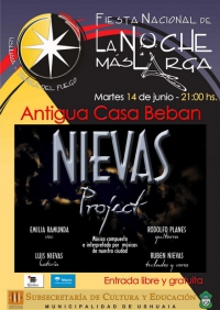 El Martes 14 de Junio se presentará, como parte de las actividades de la Fiesta Nacional de la Noche mas Larga, el Grupo Nievas Project. En esta oportunidad participarán Emilia Ramunda en Voz y AutorÃa, Luis Nievas en BaterÃa, Rodolfo Planes en Guitarras y Composición, y Ruben Nievas en Teclados, Programación y Composición.