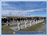 Desde el Miércoles 28 hasta el Lunes 23 de Abril de 2012 se podrá visitar la muestra fotográfica "Homenaje a los Héroes de Malvinas. En conmemoración de 30° Aniversario de la Gesta de Malvinas". Expone Carmen Miranda. La Muestra permanecerá en el Foyer Ego Pereda de la Casa de la Cultura.