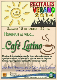 El Sábado 18 de Enero de 2014 se realizará el espectáculo musical Homenaje al Viejo Café Latino a las 22:00 hs. en la Sala Niní Marshall de la Casa de la Cultura.
