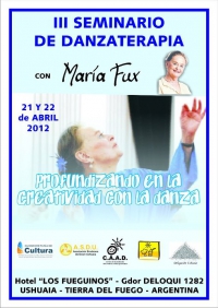 Los dÃas Sábado 21 y Domingo 22 de Abril de 2012 se llevará a cabo el III Seminario de Danzaterapia, dictado por MarÃa Fux con el lema "Profundizando en la creatividad con la danza". Para mayor información escribir a mariafux_ushuaia@hotmail.com o comunicarse al tel. 437416 (CAAD)