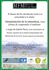 El Martes 5 de Julio de 2011 se brindará una charla sobre Interpretación de la naturaleza, otras formas de comprender el ambiente. La misma estará a cargo de Gabriel Terny, quien es GuÃa Universitario de Turismo y docente de la materia Interpretación del Patrimonio de la E.A.N.(Escuela Argentina de Naturalistas).