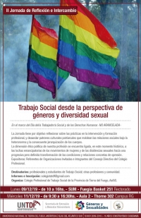 La II Jornada de Reflexión e Intercambio "Trabajo Social desde la Perspectiva de Géneros y Diversidad Sexual" se llevará a cabo en Ushuaia el Lunes 9 de Diciembre de 2019 de 10:00 a 16:00 hs.