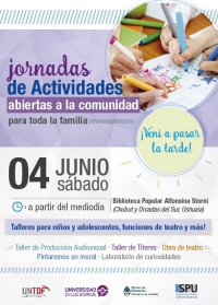 El Sábado 4 de Junio de 2016 la UNTDF realizará una jornada abierta a la comunidad en la Biblioteca Popular Alfonsina Storni, con el lema "Universidad en los barrios, los barrios en la Universidad".