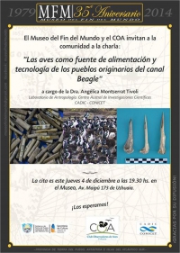 El Jueves 4 de Diciembre de 2014 la Dra. Angélica Tivoli brindará la charla "Las aves como fuente de alimentación y tecnología de los pueblos originarios del Canal Beagle".