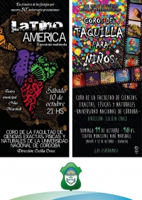 El Sábado 10 a las 21:00 hs. presentará "Latino América" y el Domingo 11 de Octubre a las 18:00 hs. en la misma sala presentara "Coros de Taquilla para Niños".