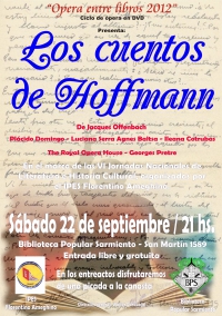 El Sábado 22 de Septiembre de 2012 en el marco de las VI Jornadas Nacionales de Literatura e Historia Cultural, se poryectará "Los Cuentos de Hoffmann" en el Ciclo Ópera entre libros. La ópera es del compositor Jacques Offenbach, con un elenco espectacular que cuenta con la participación de Plácido Domingo, Agnes Baltsa, Luciana Serra e Ileana Cotrubas en los roles principales.