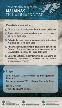El Martes 3 de Abril de 2012 se realizará la presentación del programa Malvinas en la Universidad.