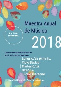 Los días 5 y 6 de Noviembre de 2018 se realizará la Muestra Anual de Música del Centro Polivalente de Arte Profesora Inés María Bustelo. El Lunes 5 a las 16:30 hs. expondrá el Ciclo Básico, el Martes 6 a las 18:00 hs. expondrá el Ciclo Orientado en la Sala Niní Marshall de la Casa de la Cultura.