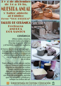 Los dÃas Sábado 3 y Domingo 4 de Diciembre de 2011 se realizará la Muestra Anual y Taller Abierto al Público. El Taller Municipal de Cerámica es dictado por la Prof. Andrea Dos Santos.