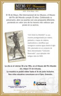 El Viernes 18 de Mayo de 2012 se realizará la presentación de la muestra "Un viaje al pasado", que organiza el Museo del Fin del Mundo. La cita es a las 19:00 hs. en el Museo del Fin del Mundo.