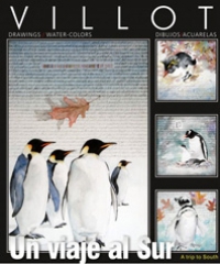 "La primera serie “Un viaje al sur”… En ella, con un “bajo continuo” de un texto ilegible, Villot plasma el relato de un hipotético viaje de exploración de las tierras australes, a modo de las expediciones que se aventuraron en el siglo pasado a descubrir el único continente desconocido, la Antártida, el fin del mundo. Es así que desfilan en los lienzos, imágenes de distintos ejemplares de pingüinos (papúa, emperador, rey, magallánico, etc) que como un detallado inventario de un cronista aventurero, se unen a misteriosas hojas de un otoño que se cierne sobre esa última tierra virgen… La segunda serie, a la que llamó “Dueños”, muestra, en base a viejas fotografías e historias sobre los pueblos originarios -Onas/Selknam y Yámanas-, reinventa retratos de los antiguos dueños de la isla, de sus bosques y llanuras, de sus montañas y lagos, de sus nieves y mar, de su fuego y su fauna. Y junto a ellos, los elementos que hacían a su vida, a su cosmovisión y a su mundo que; aunque ya desaparecido, convive aún hoy con nosotros en el viento que mueve el follaje, en los sonidos del bosque, en el murmullo del agua, en las nubes que pasan. En sus composiciones, Villot insta al espectador a participar de ese diálogo íntimo, a ser protagonista con silencios y miradas de esa historia que cada día, una y otra vez, nos cuenta la Tierra".