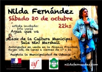 El Sábado 20 de Octubre de 2012 se presentará Nilda Fernández en nuestra ciudad. Como invitado estará el trÃo local "Agua que va". La cita es en la Sala Ninà Marshall de la Casa de la Cultura a las 22:00 hs.