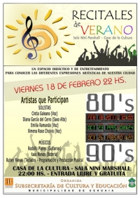 Los "Recitales de Verano" que históricamente ha organizado en la subsecretarÃa municipal de cultura, se han transformado en un ciclo musical gratuito, que se realizan en la "Sala Nini Marshall" de la casa de la cultura. Estos brindan un espacio que permita dar a conocer las diferentes expresiones artÃsticas sonoras que producen los artistas en nuestra ciudad, como asà también, a la población toda, la posibilidad de compartir todos los viernes del mes de Enero y Febrero diferentes espectáculos.