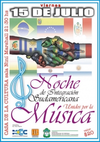 El Viernes 15 de Julio de 2011 a las 21:30 hs. se realizará el espectáculo musical Noche de Integración Sudamericana "Unidos por la música". La cita es en la Sala Ninà Marshall de la Casa de la Cultura y la entrada tiene un valor de 20 pesos.