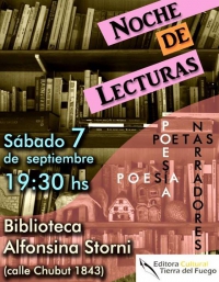 El Sábado 7 de Septiembre de 2013 se realizará una Noche de Lecturas en la Biblioteca Alfonsina Storni -Chubut 1843- a partir de las 19:30 hs. con la participación de poetas y narradores.