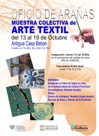 Desde el Jueves 13 hasta el Miércoles 19 de Octubre de 2011 se podrá visitar la muestra "Oficio de Arañas". Exponen sus trabajos alumnos del Taller de Tejido en Telas a cargo de Elisabet Quallio.