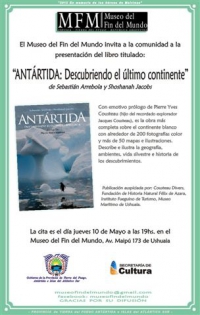 El Jueves 10 de Mayo de 2012 se realizará la presentación de "Antártida: descubriendo el último continente", libro de Sebastián Arrebola y Shoshanah Jacobs. La cita es en el Museo del Fin del Mundo, Maipú 173, a las 19:00 hs.