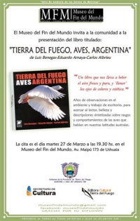 El Martes 27 de Marzo de 2012 se realizará la presentación del libro "Tierra del Fuego, Aves, Argentina". La misma tendrá lugar en el Museo del Fin del Mundo, Maipú 173, a las 19:30 hs.