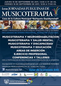 Los días Jueves 15 y Viernes 16 de Septiembre de 2011 se llevarán a cabo las Primeras Jornadas Fueguinas de Musicoterapia. Destinadas a profesionales de la salud, de la educación y público interesado.