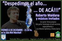 El Viernes 6 de Diciembre de 2013 Roberto Maidana presentará el espectáculo musical "Despedimos el año... de acá!!!" con músicos invitados en la Sala Niní Marshall de la Casa de la Cultura a las 21:30 hs.. La entrada es libre y gratuita, el ingreso es por orden de llegada.