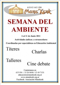 Del 6 al 11 de Junio de 2011 la Asociación Mane'kenk llevará adelante la Semana del Ambiente con actividades áulicas y extraescolares coordinadas por especialistas en Educación Ambiental. Habrá tÃteres, charlas, talleres y cine debate. Para mayor información escribir a educacion@manekenk.org.ar