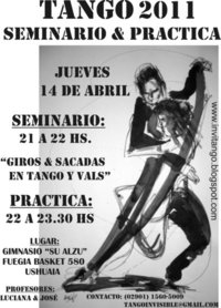 El dÃa Jueves 14 de Abril de 2011 se llevará a cabo el Seminario "Giros y Sacadas en Tango y Vals" de 21:00 hs. a 22:00 hs. y una Práctica de Tango de 22:00 a 23:30 hs. A cargo de los profesores Luciana y José. La cita es en el gimnasio Su Alzu, F. Basket 580.