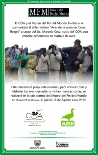 El Jueves 18 de Agosto de 2011 el Lic. Marcelo Cruz dictará el taller teórico "Aves de la Costa del Canal Beagle". El LIc. Cruz es socio del COA y cuenta con una amplia experiencia en avistaje de aves.