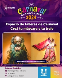 El Domingo 11 de Febrero de 2024 se brindará el Taller de Carnaval "Creá tu Máscara y tu Traje" en la Antigua Casa Beban de 16:00 a 19:00 hs.